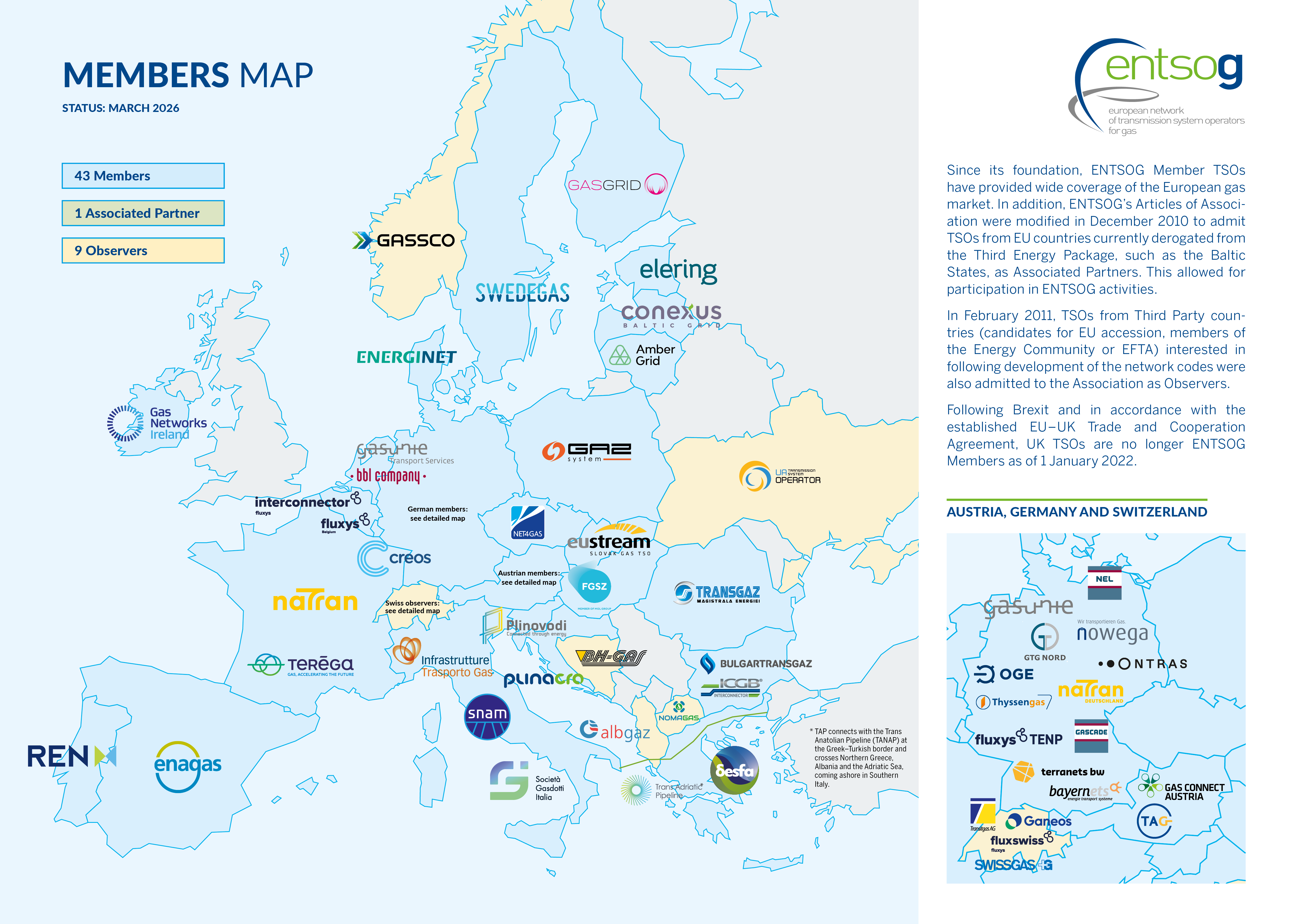 In February 2011, TSOs from Third Party countries (candidates for EU accession, members of the Energy Community or EFTA) interested in following development of the network codes were also admitted to the Association as Observers. Following Brexit and in accordance with the established EU-UK Trade and Cooperation Agreement, UK TSOs are no longer ENTSOG Members as of 1 January 2022.