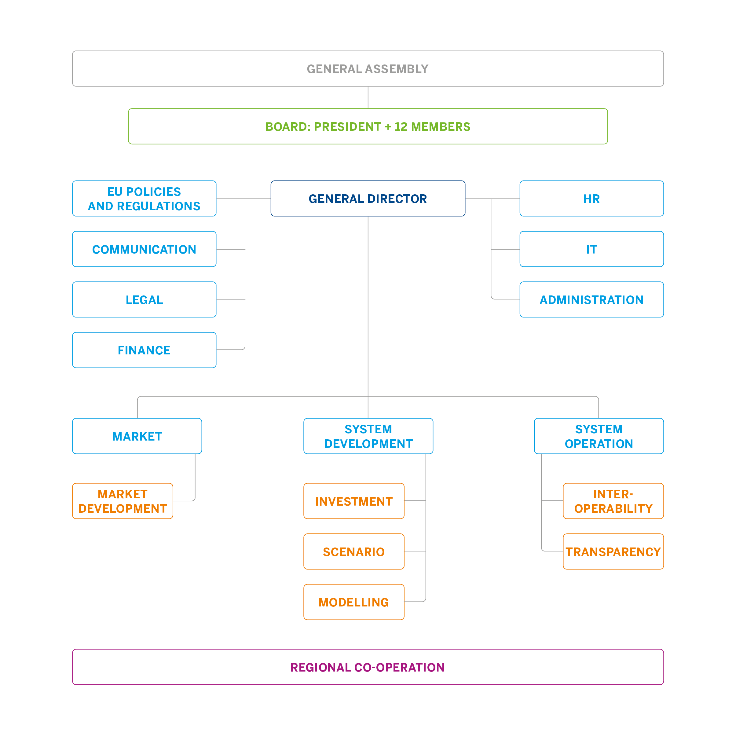 ENTSOG operations are governed by its General Assembly, which leads the Association and has full powers to enable it to achieve its objectives. Its tasks include the admission of Members; the appointment of the Management Board, the General Director and Business Area Directors; the establishment of working and regional groups; and the adoption of ENTSOG deliverables.